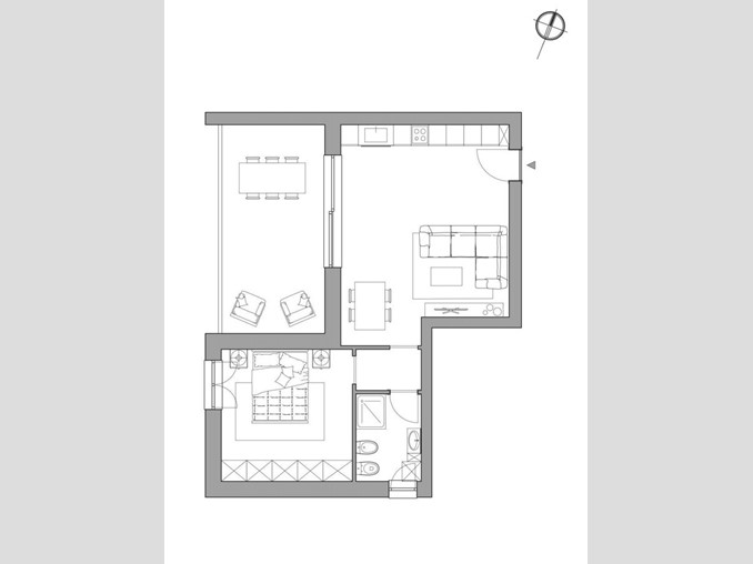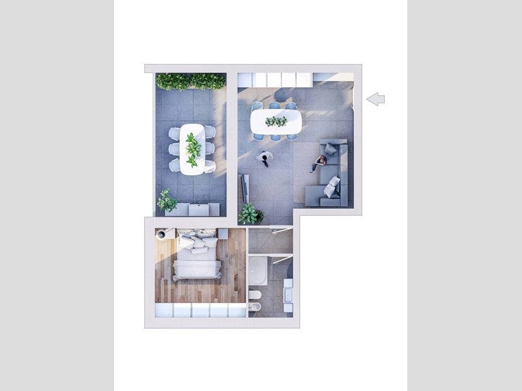 APPARTAMENTO A9 - Due locali, posto al secondo piano composto da: ingresso su zona living con cucina a vista serviti da uno splendido terrazzo esposto ad ovest. Il disimpegno conduce alla zona notte dove troviamo una camera matrimoniale e una balcone finestrato.
