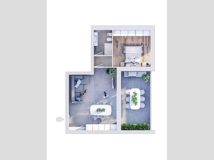 APPARTAMENTO B10 - Due locali, posto al secondo piano composto da: ingresso su zona living con cucina a vista serviti da uno splendido terrazzo esposto ad est. Il disimpegno conduce alla zona notte dove troviamo una camera matrimoniale e una balcone finestrato.