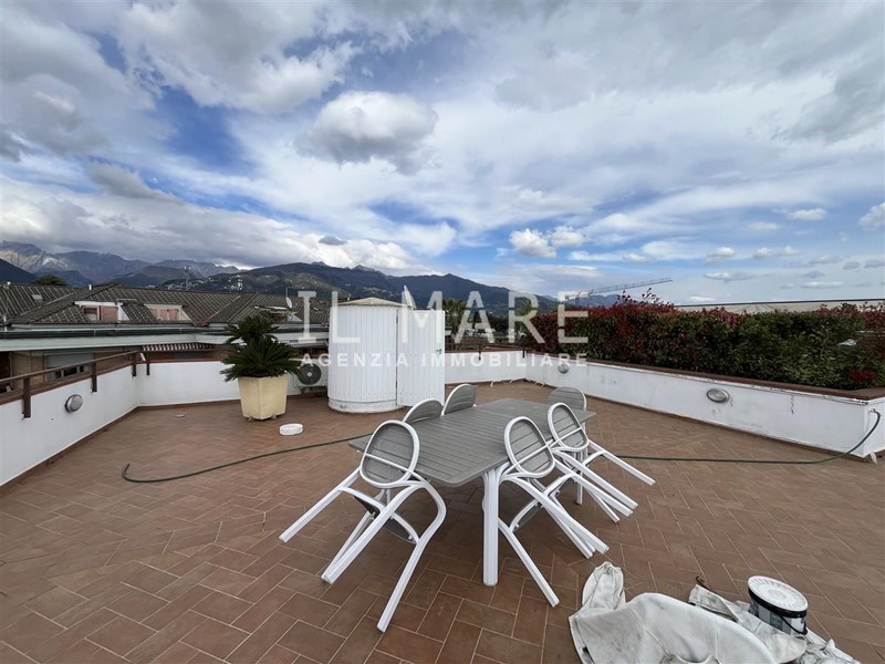 Marina di Massa: a circa 1.500 mt. dal mare, disponibile alla vendita appartamento posto al piano primo e ultimo. L'immobile si presenta in ottimo stato di manutenzione ed è composto internamente da ingresso, ampia sala con cucina a vista e accesso al balcone, disimpegno notte, due camere da letto e bagno finestrato con doccia. Dal balcone, tramite scala a chiocciola, si accede a grande terrazza con stupenda vista sulle Alpi Apuane. Detta terrazza può essere attrezzata con doccia esterna, cucinotto e un ampio gazebo (o pompeiana) per passare le giornate all'insegna del relax!