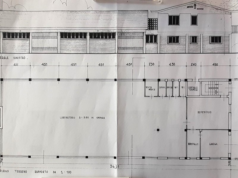 Il capannone più grande con doppio ingresso carrabile ha una metratura di 450 mq circa (H 3,80 in gronda) comprensiva di due uffici, spogliatoio, doppi servizi, ampio refettorio già attrezzato per la somministrazione e spazioso garage/deposito con ingresso indipendente.