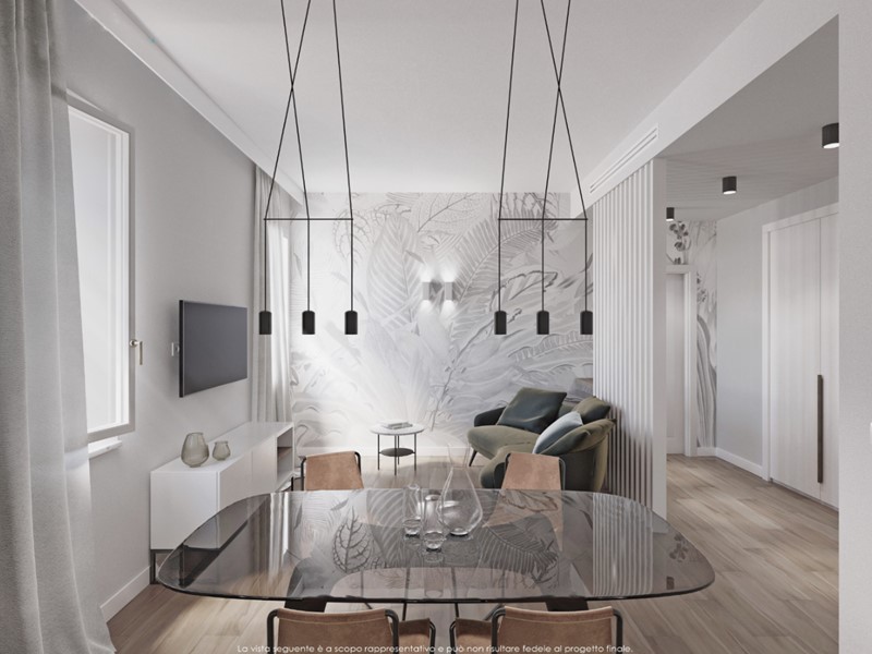 L’abitazione, della superficie di 70 mq. circa, è costituita da ingresso (con piccolo angolo guardaroba) collegato ad un'ampia zona soggiorno/pranzo/cottura (oltre 24 mq. complessivi) con accesso al balcone (4 mq. circa), disimpegno-notte, camera da letto matrimoniale, camera singola e bagno finestrato dotato di doccia.