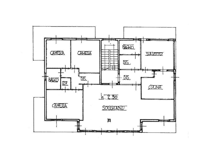 Attualmente è composto da ingresso nel spazioso soggiorno da cui si accede ai due balconi, cucina abitabile con sala pranzo servita da balcone, bagno, la zona notte rimane ben divisa dove troviamo tre camere con doppi servizi.