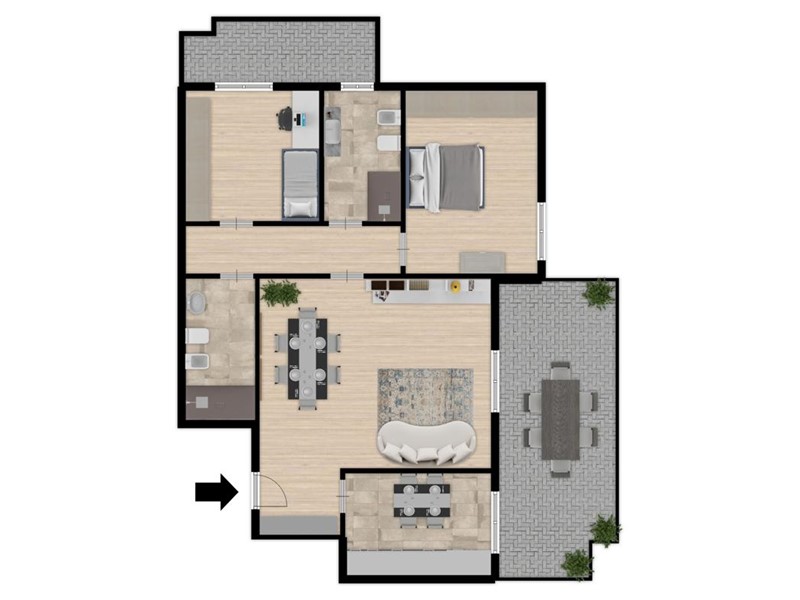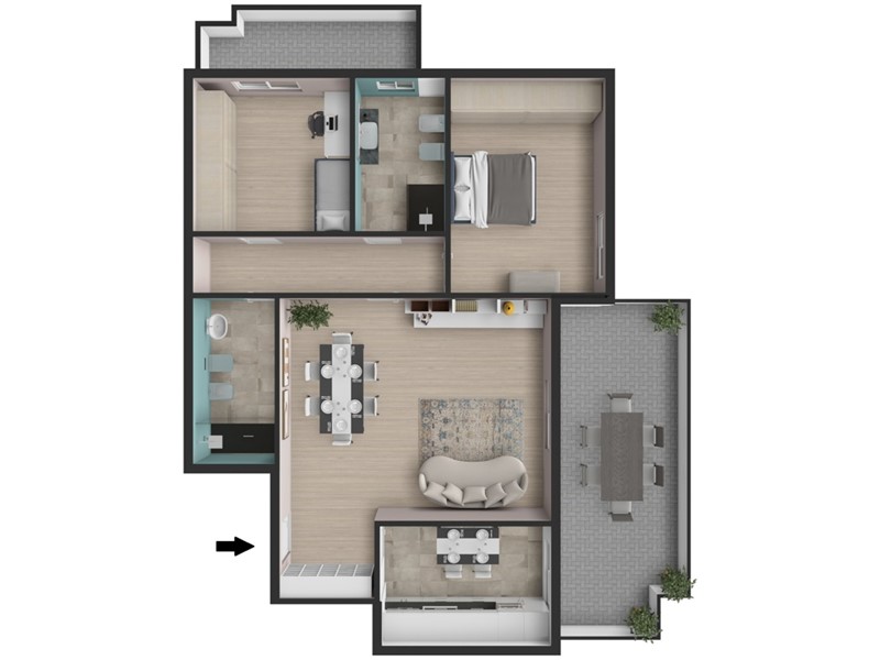 APPARTAMENTO A3 - Tre locali e doppi servizi, posto al terzo piano composto da: ingresso, soggiorno e cucina abitabile serviti da uno splendido terrazzo esposto a est. Il disimpegno conduce alla zona notte dove troviamo una camera matrimoniale, una cameretta servita da balcone e due ampi bagni disimpegnati uno dei quali con affaccio su balcone.