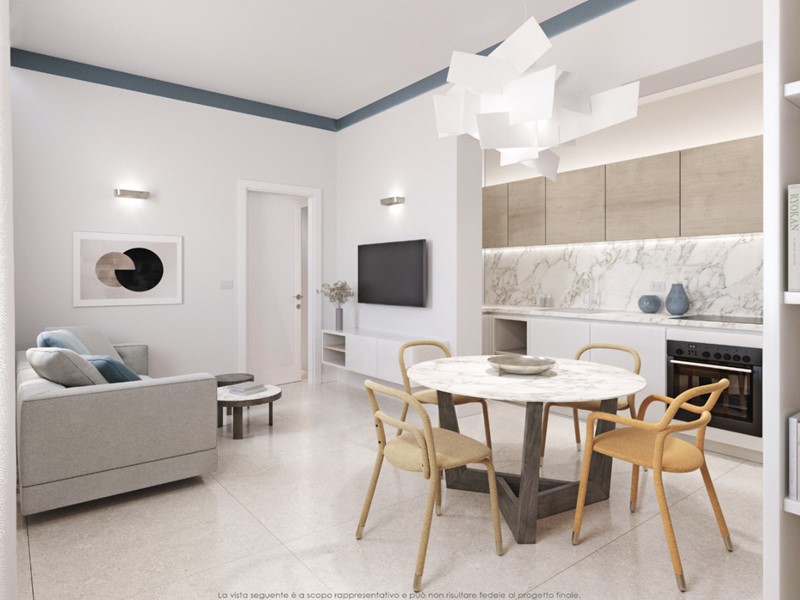 L’abitazione, della superficie di 67 mq. circa, è costituita da ampio soggiorno/pranzo (21 mq. circa) con angolo cottura, disimpegno-notte, bagno finestrato dotato di doccia, camera da letto matrimoniale con piccolo guardaroba e camera singola, entrambe con accesso ad un lungo terrazzo. Impianto di riscaldamento/raffreddamento a pompa di calore con accumulo acqua calda sanitaria. Classe energetica prevista: A1.