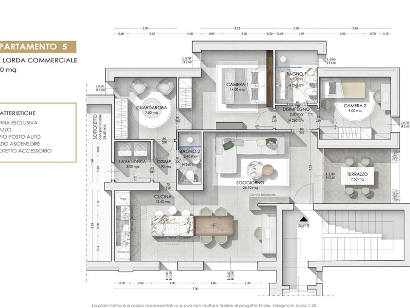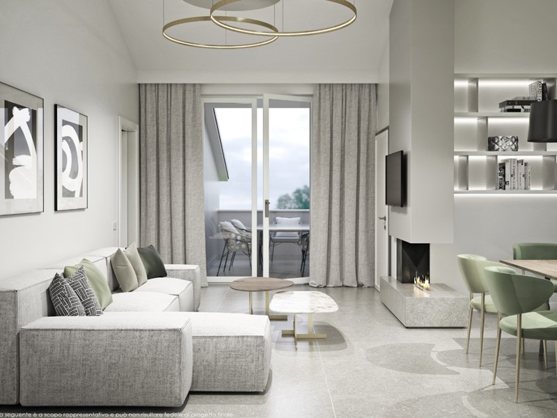 L’appartamento, della superficie di 100 mq. circa oltre a terrazza e sottotetto accessorio, è caratterizzato da un’ampia e luminosa zona living (quasi 40 mq.), con il soggiorno aperto sulla terrazza abitabile, la spaziosa cucina pensata con zona cottura/pranzo ad isola ed un angolo studio. Il soggiorno è anche dotato di caminetto a bioetanolo.