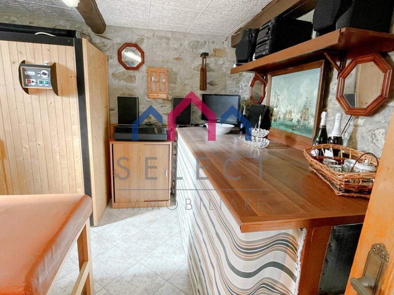 Si compone al piano seminterrato con accesso esterno da due vani ad uso di cantina; al piano terra ingresso, zona relax, zona pranzo con camino, cucinotto, disimpegno e wc.