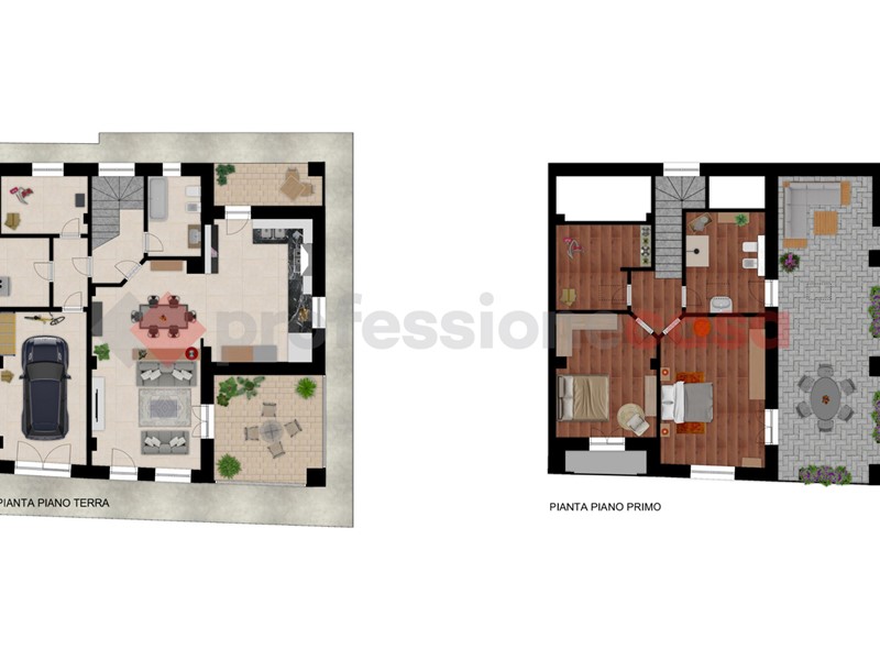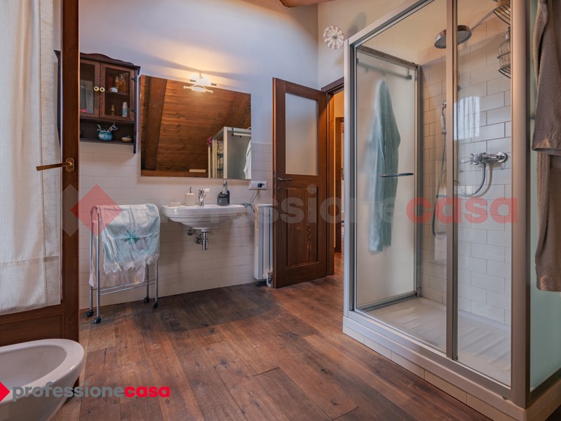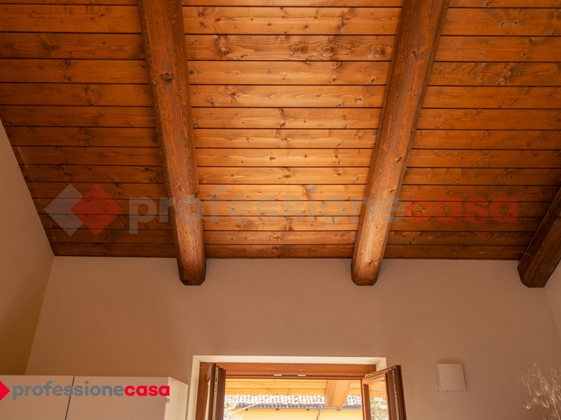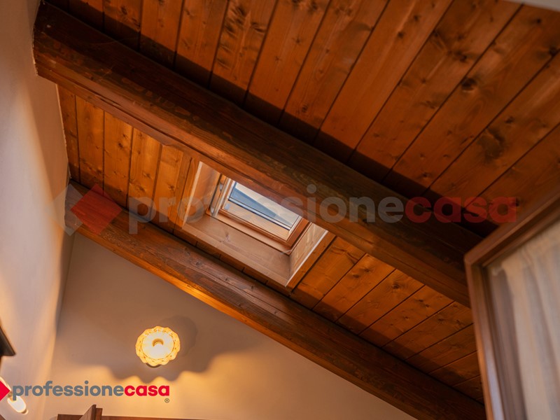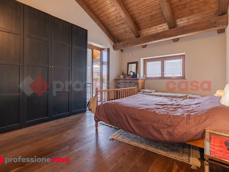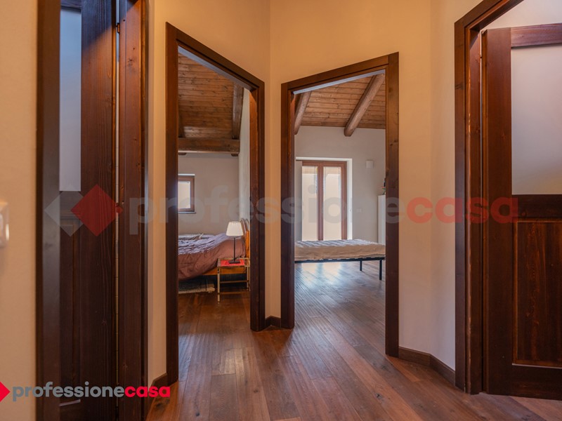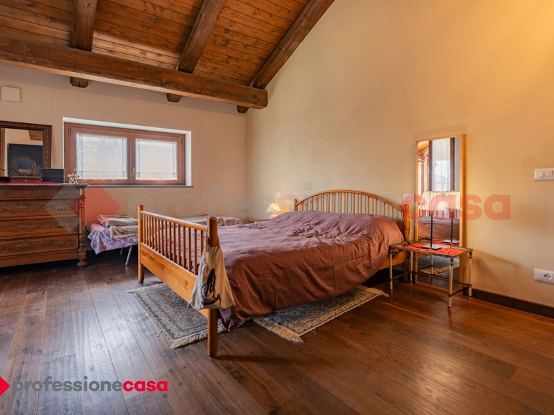 Tramite comoda scala rifinita in pietra posta nel disimpegno, si accede al piano superiore con tetto con travi in legno a vista, dove son collocate l'ampia camera matrimoniale con accesso al terrazzo di 40mq fornito di tendaggi su misura, ulteriore camera matrimoniale e la sala da bagno con doccia; Completa il piano un locale di sgombero di generose dimensioni che può essere utilizzato anche in qualità di studio.