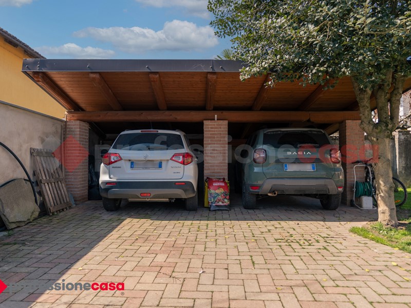 L'area esterna è caratterizzata da un camminamento in autobloccanti che unisce l'accesso carraio/pedonale all'abitazione, al box e alla tettoia che può comodamente ospitare due vetture; la restante porzione è dedicata a prato ed area orto posta nel retro.
