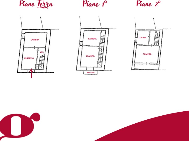 Al piano terra troviamo l'ingresso, una camera e un bagno; al primo piano due camere luminose e un balcone che si affaccia sulle suggestive vie del paese, regalando scorci tipici e un'atmosfera senza tempo. Il secondo piano ospita una cucina e un'ulteriore camera, ideale come sala da pranzo, soggiorno o terza camera da letto.