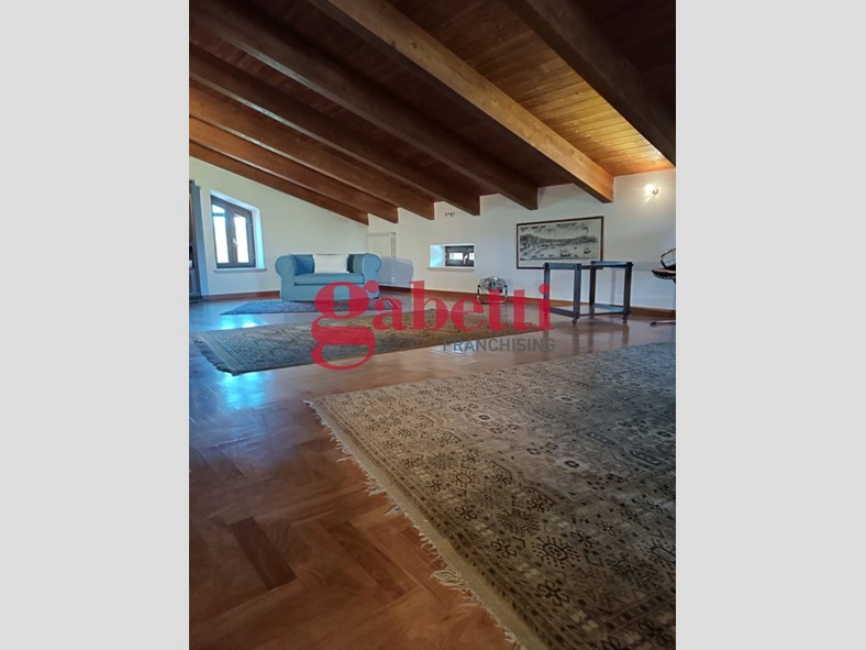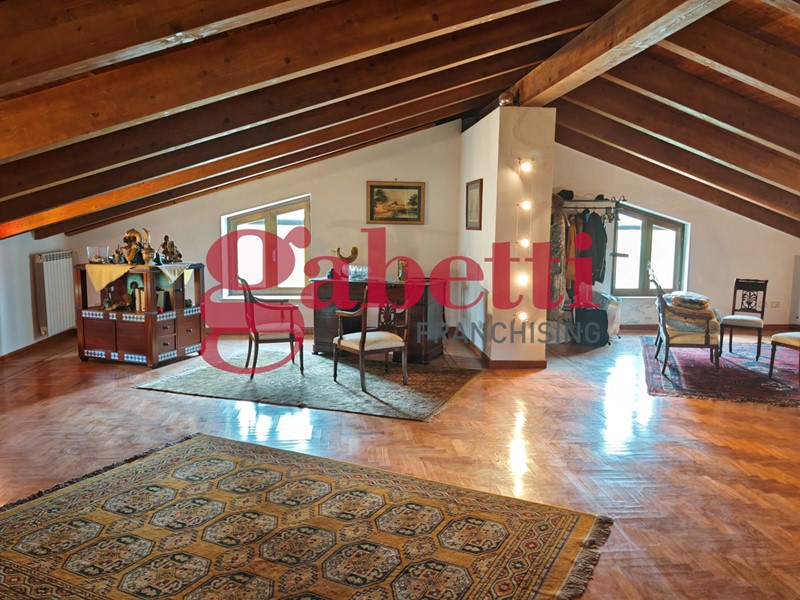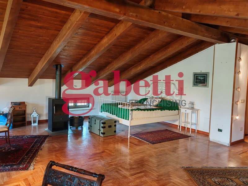 La mansarda, all'ultimo livello, è un ambiente open space dal fascino unico, con tetto in legno a vista, pavimento in parquet, stufa Wiking e un bagno completo di vasca idromassaggio Jacuzzi. Le ampie finestre rendono lo spazio incredibilmente luminoso, creando un'atmosfera accogliente e raffinata.