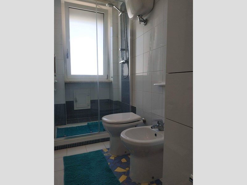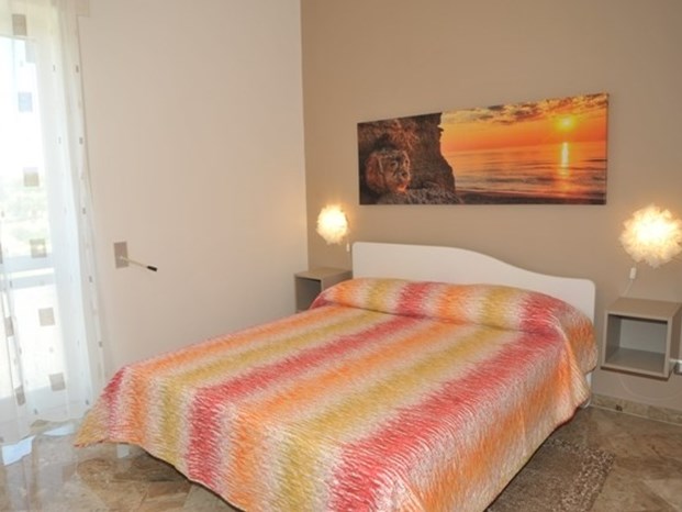 Una camera matrimoniale con tv e aria condizionata, una cameretta con due letti a castello con tv e bagno. Massimo comfort e vista mare. Possibilità di avere il box auto a parte