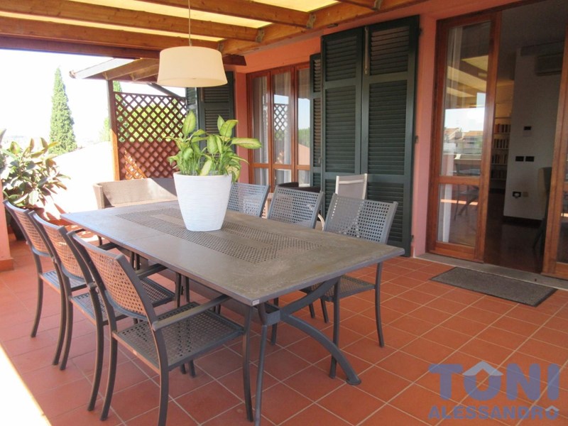 EMPOLI SPLENDIDO ATTICO in vendita, costruito da un famoso costruttore, in edificio anni 2000. Bellissima abitazione di circa 140 metri quadri, posta al terzo ed ultimo piano, con il privilegio di essere l'unica abitazione all'ultimo livello. Il luminoso appartamento si sviluppa su un unico piano: è composto nella zona living da soggiorno, sala da pranzo e cucina, e nella zona notte da 3 camere da letto, lo studio, 2 bagni, e il disimpegno. La raffinata zona living gode di ampie vetrate dalle quali accediamo ad una grande terrazza, arredata con pergolato in legno e barbecue, ideale per i pranzi e le cene, o dove rilassarsi in totale riservatezza. Anche il resto dei vani posseggono ulteriori terrazzi, in quanto l'appartamento è circondato su tutti e 4 i lati da ben cinque terrazze per complessivi 70 metri quadri. Bellissima la pavimentazione interna in parquet, perfetti i serramenti interni ed esterni in legno, confortevoli l'impianto di climatizzazione ed di riscaldamento indipendente bizonale, serenità ci dona l'impianto di allarme e la porta blindata, comodità trasmettono le zanzariere alle porte e finestre. Il garage è fornito di basculante automatizzato, e la sua superficie sono circa 40 metri quadri, sufficiente per due posti auto. L'autoclave dell'impianto idrico garantisce la pressione costante dell'acqua nell'abitazione. Il pregevole condominio è di piccole dimensioni ed è dotato di ascensore. Perfetta per chi cerca una villa in città sopra a tutti e desidera i vizi dei confort e dalla riservatezza. C.E: E. In esclusiva: 495.000 €