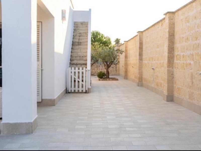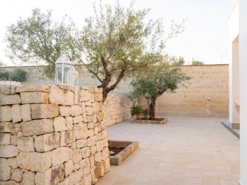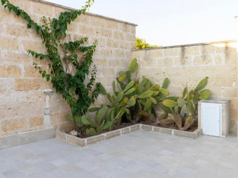 Nel giardino, in parte pavimentato, sono presenti piante ornamentali, fichi d’India e alberi di ulivo.