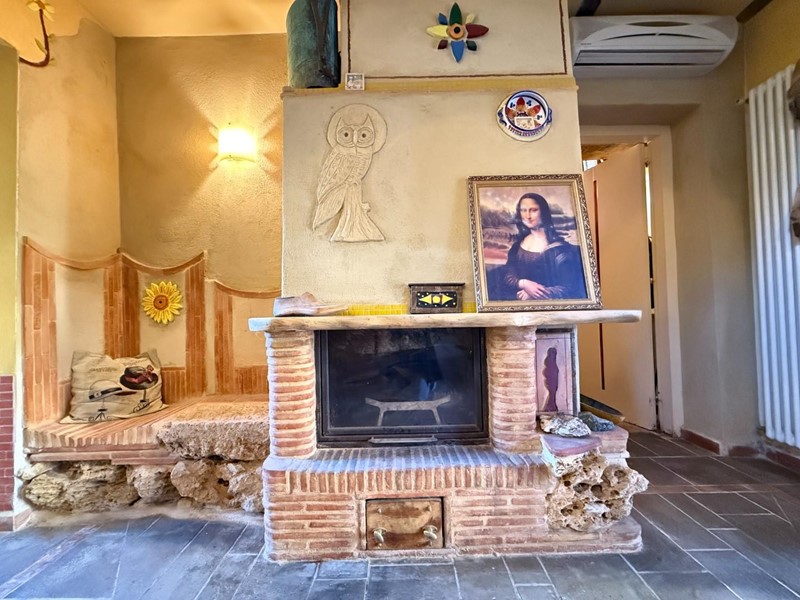 Un accogliente cortile esterno precede la porta d’ingresso che accompagna il visitatore all’interno di un primo salottino fornito di camino e accesso diretto alla cucina abitabile. Partendo da quest’ultima si prosegue con la sala da pranzo: un ambiente spazioso e luminoso dotato di ampio tavolo, zona relax con divano e piano soppalcato che si affaccia sul soggiorno. Lo stesso livello ospita il primo bagno con pavimenti e rivestimenti in mosaico verde, mentre dividendo l’ampio soggiorno l’attuale proprietà ha temporaneamente ricavato una camera da letto matrimoniale con pareti caratterizzate da archi a tutto sesto.