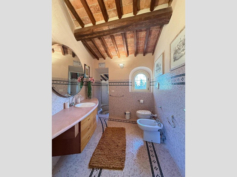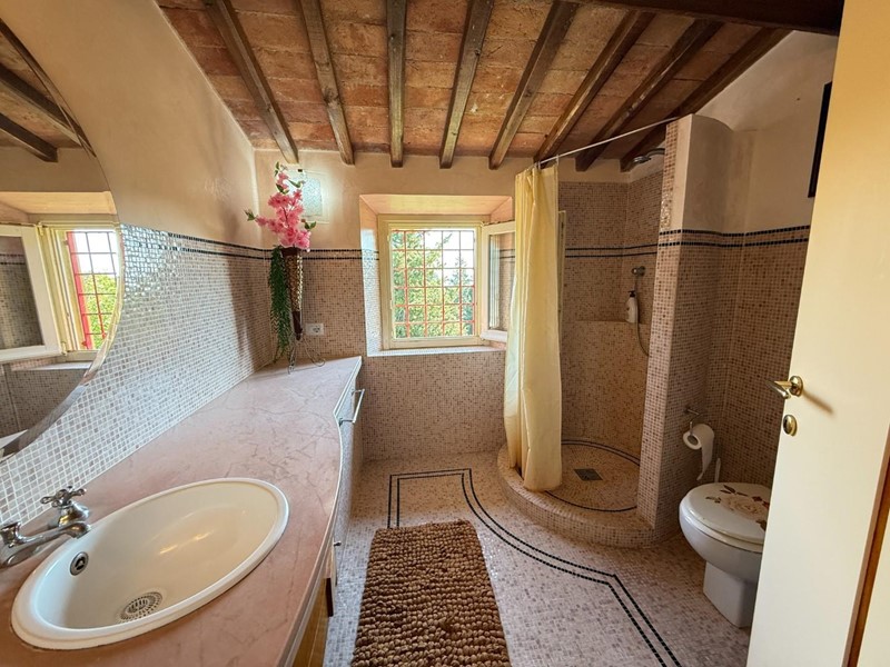 La scala in ferro sita nel salottino d’ingresso accompagna i visitatori negli ambienti del livello superiore. Il primo piano è composto da un atrio con armadi a muro, due camere da letto e lo splendido bagno con il pianale in marmo, rivestito in mosaico rosa con inserti in nero con la bellissima vasca con doccia ed idromassaggio. Tutti gli ambienti sono collegati da un corridoio con affaccio sul balcone panoramico. Le dotazioni degli interni ricalcano fedelmente lo spirito rustico tipico dei casali toscani, con raffinati particolari decorativi che conferiscono fascino e calore agli spazi abitativi.