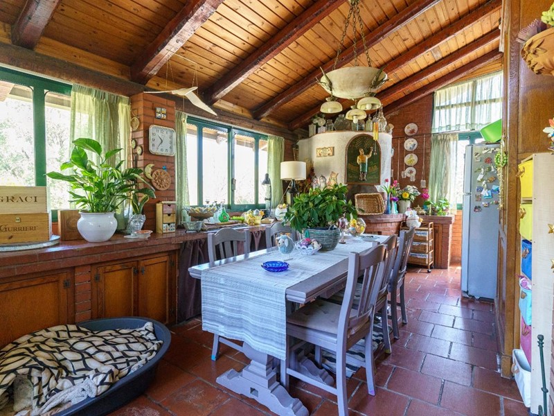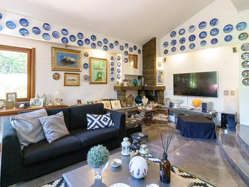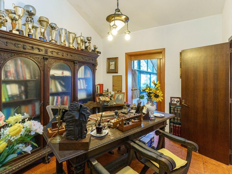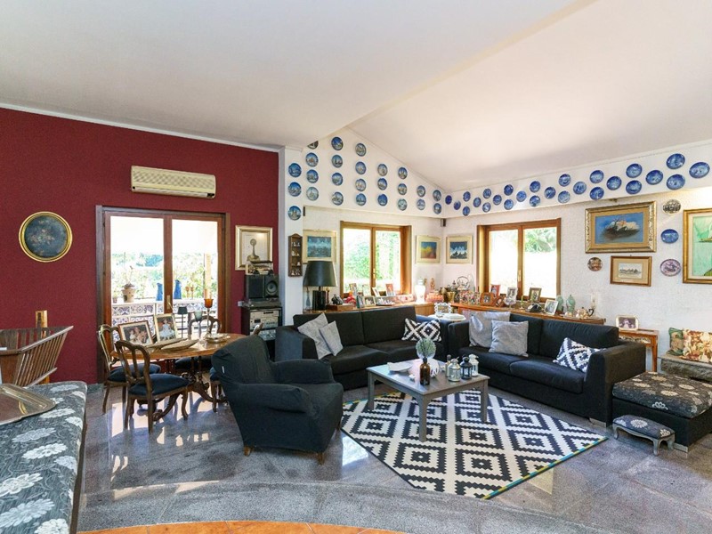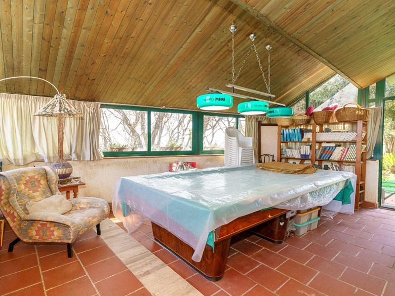 L’immobile comprende 17 locali, tra cui un doppio salone con camino e accesso a una pergola esterna, una cucina spaziosa con zona lavanderia e dispensa, una sala da pranzo con forno a legna, due studi, una zona living utilizzata come sala biliardo, cinque camere da letto e sei bagni in totale.