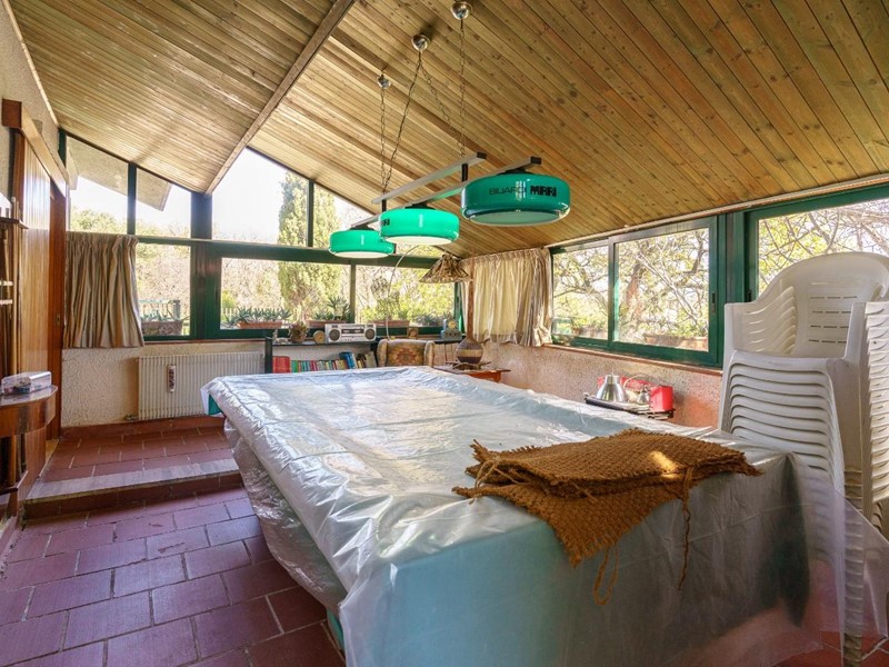 • Piano terra: ingresso su doppio salone con camino e accesso alla pergola esterna, disimpegno che conduce a una cucina spaziosa con zona lavanderia e dispensa, sala da pranzo con forno a legna, due studi, zona living con sala biliardo e due bagni.