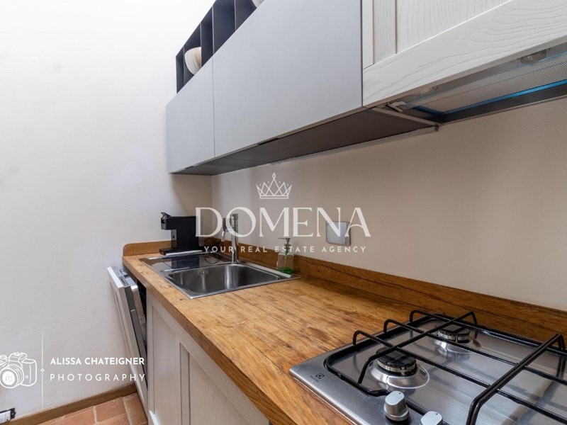 L’accesso avviene tramite una tipica scala esterna condivisa con una sola altra unità. L’interno accoglie con ambienti caldi e luminosi: soffitti alti con travi a vista, soggiorno con zona pranzo, cucinotto, due ampie camere da letto, un bagno finestrato con box doccia e disimpegno. Completa la proprietà un giardino privato (non adiacente), ideale per momenti di relax all’aperto.