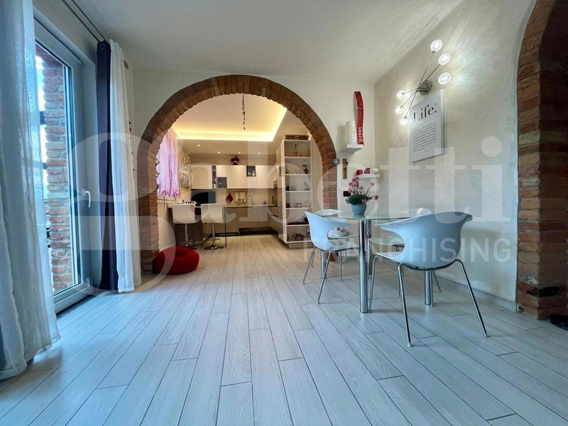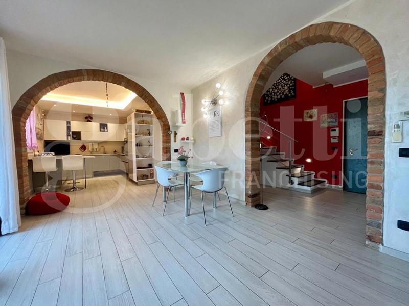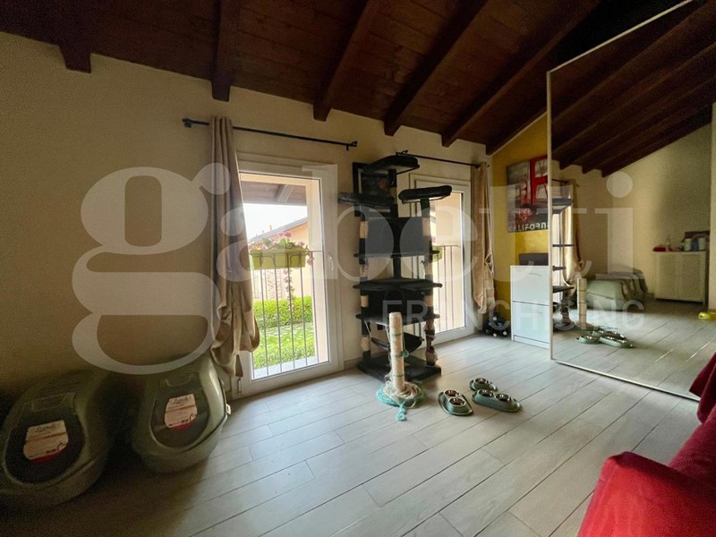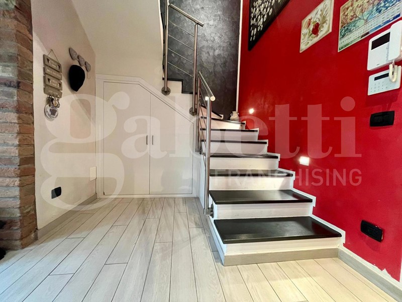 La soluzione si sviluppa su due livelli: al piano terra troviamo un ampio soggiorno con cucina open space, caratterizzato da grandi vetrate che affacciano sul giardino, ideale per chi cerca luminosità e continuità tra interno ed esterno. Completa il piano un comodo bagno con antibagno e un ripostiglio.