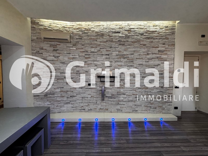 L'ingresso si apre su un accogliente soggiorno con doppia finestra, impreziosito da una parete in pietra bianca a vista e da un raffinato sistema di illuminazione a LED che dona calore e modernità all'ambiente.