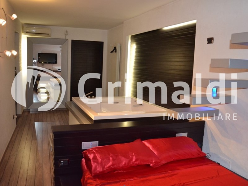 La zona notte ospita una spaziosa camera da letto con una splendida vasca idromassaggio integrata e una scala dal design moderno, con luci LED incassate, che conduce al livello superiore dove si trova una comoda cabina armadio con accesso a un balcone privato.