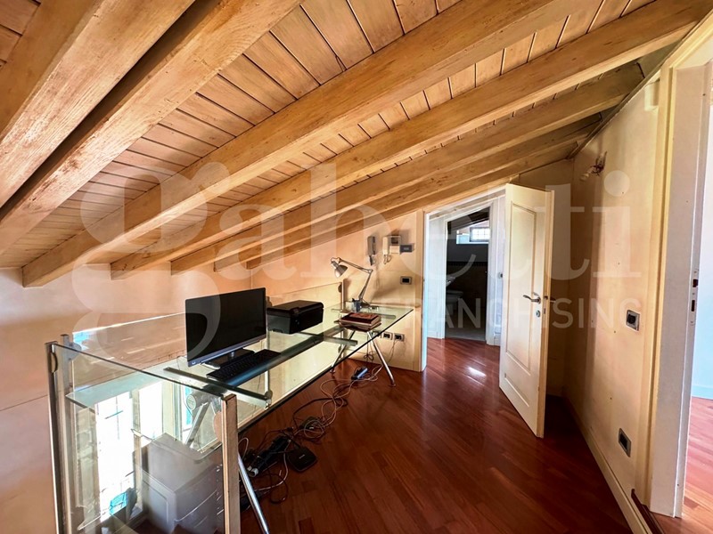 Un'elegante scala accompagna al piano superiore dove il soppalco, affacciato sulla zona living, introduce alla zona notte composta di tre camere da letto, di cui una padronale con cabina armadio e bagno con vasca idromassaggio, e da un ulteriore servizio che serve le restanti due camere. Le stanze sono caratterizzate da spettacolari vetrate che incorniciano viste mozzafiato sul Duomo, il Castello e i tetti dei palazzi storici.