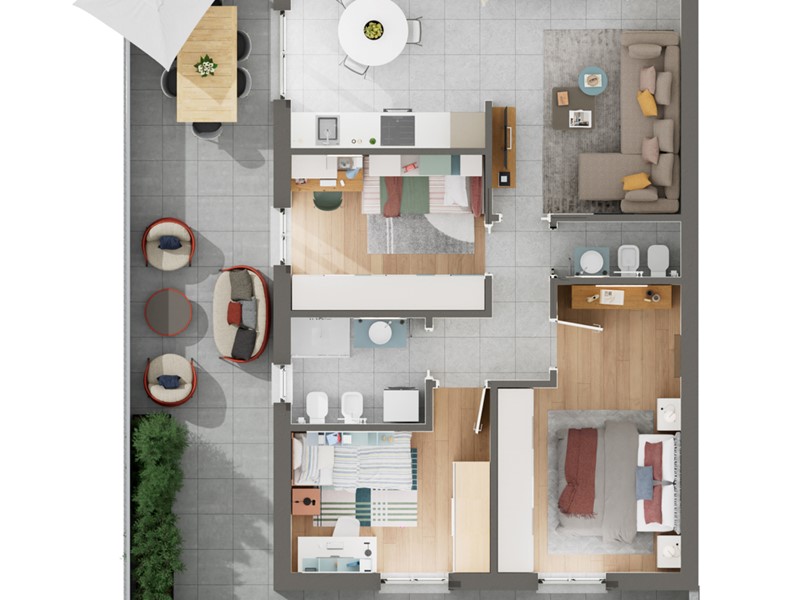 Gli ampi terrazzi rappresentano un'estensione naturale degli spazi interni, creando un ambiente ideale per socializzare e godersi la tranquillità.