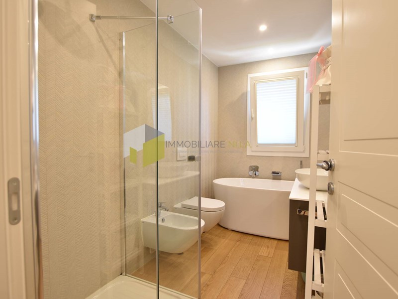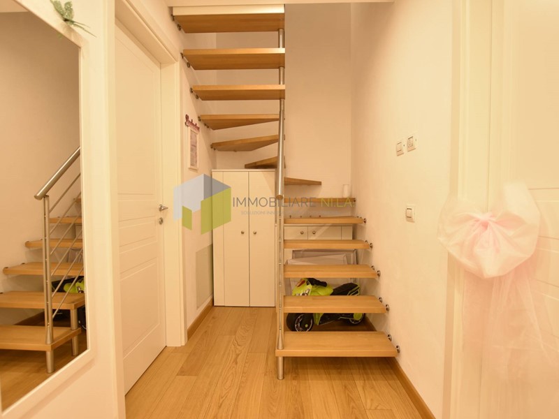 Unelegante scala conduce al piano primo, nella zona notte, dove troviamo una bella camera matrimoniale con ampia terrazza, la camera singola con balcone e il bagno con doccia, vasca e finestra.