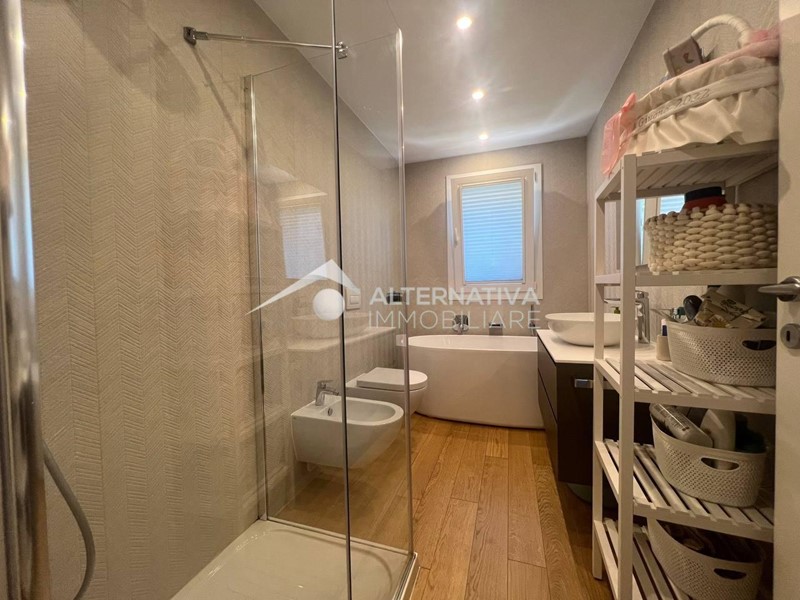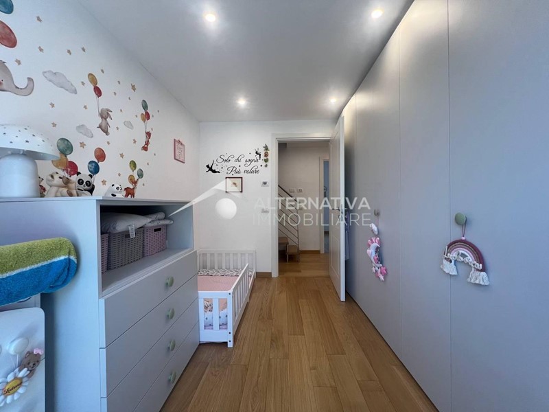 Al secondo piano, camera matrimoniale con terrazza, camera singola con balcone e secondo bagno finestrato con doccia e vasca.