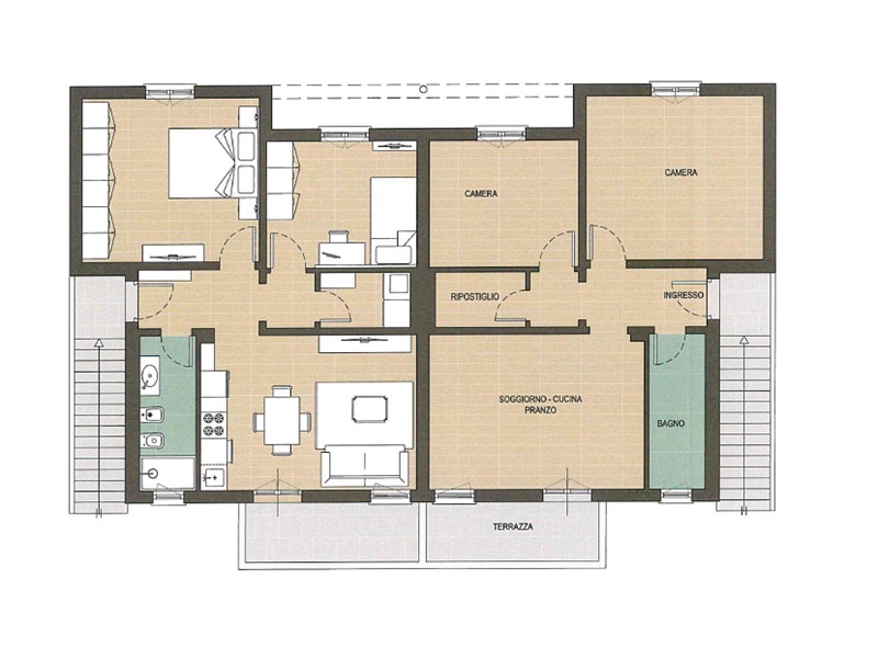 Gli appartamenti del piano primo hanno un comodo terrazzo, accessibile dal reparto giorno, e l'accesso all'appartamento è da scale esterne.