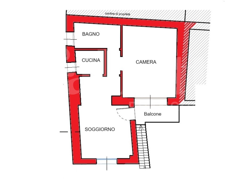 Piano Primo accessibile da scala esterna: soggiorno, cucina, camera matrimoniale e bagno.