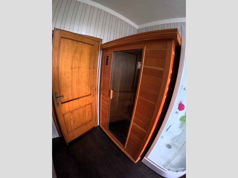 l'altra unità si sviluppa su due piani per 195 mq al pianterreno troviamo lo studio ed un bagno, nonchè un garage di ampia metratura ben soppalcato per darne una doppia fruibilità, al piano superiore tre camere da letto, di cui due matrimoniali, bue bagni (uno con cabina sauna) bel soggiorno e cucina abitabile.