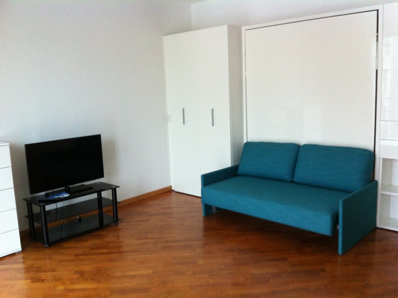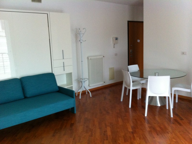 Disponiamo di un signorile e luminoso monolocale posto al 4 piano con ascensore. Ingresso, mono ambiente (soggiorno/cucina a scomparsa) che si affaccia su un soleggiato terrazzo, bagno con balcone, cantina e box auto. Ben arredato con mobili su misura e letto a scomparsa.