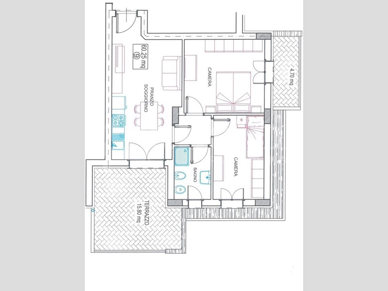 L'appartamento in questione, situato al primo piano, si compone di un ampio e luminoso soggiorno con cucina a vista e accesso a un terrazzo abitabile, una camera matrimoniale con balcone, una cameretta e un bagno finestrato con doccia. La soluzione abitativa offre comfort e funzionalità, ideale per chi cerca un'abitazione moderna e ben progettata.