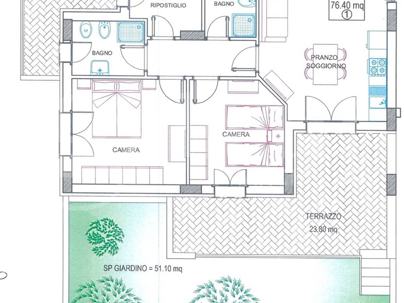 L'appartamento in questione, situato al piano terra, si compone di un ampio e luminoso soggiorno con cucina a vista e accesso su terrazzo abitabile e a grande giardino, due camere matrimoniali con terrazzo, un ripostiglio e due bagni con doccia. La soluzione abitativa offre comfort e funzionalità, ideale per chi cerca un'abitazione moderna e ben progettata.