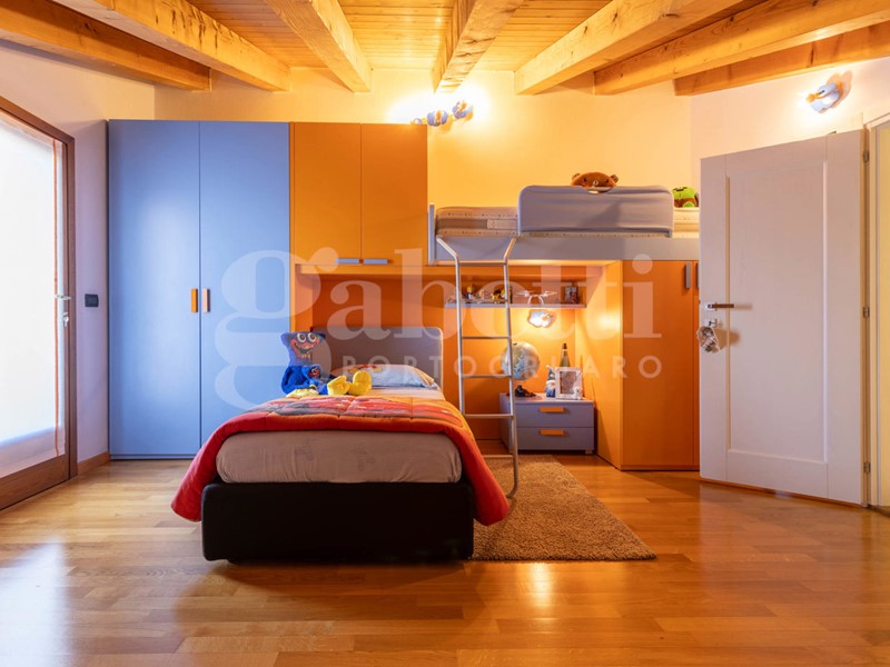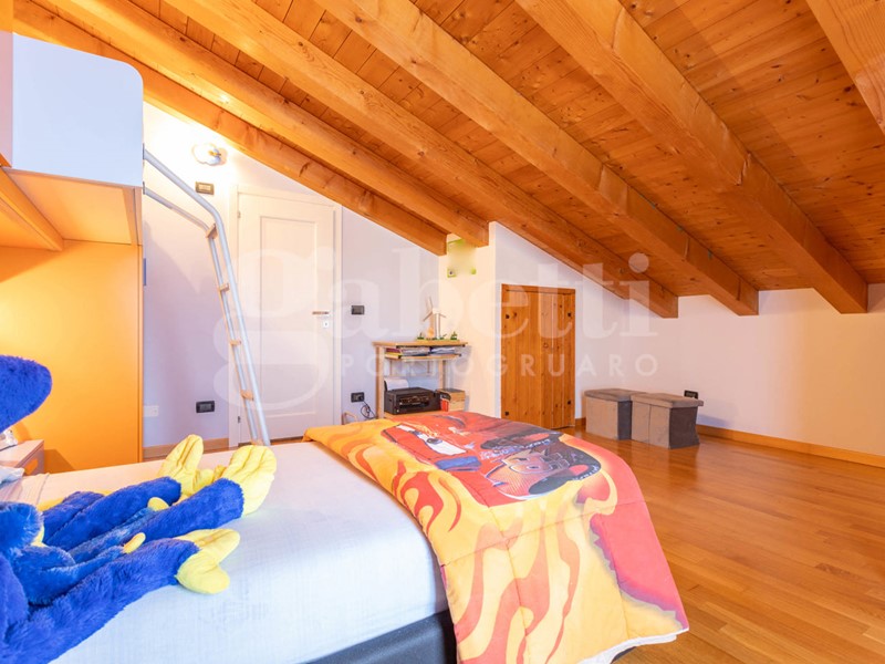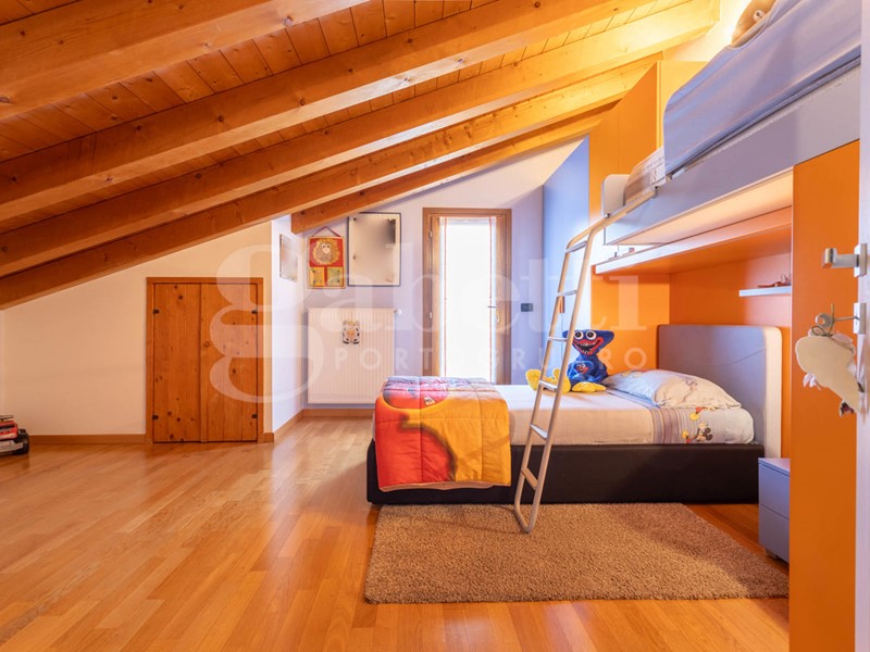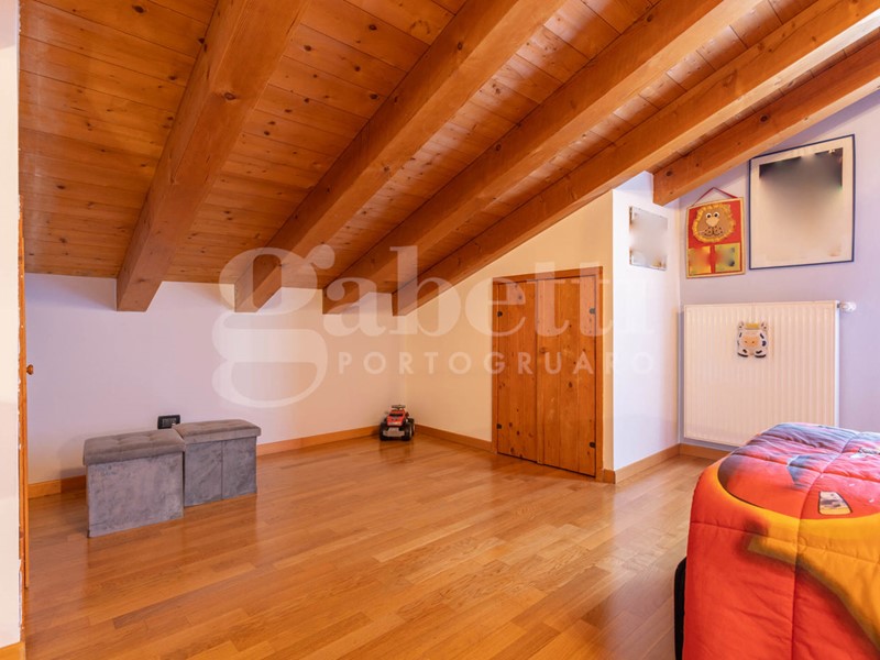 Salendo al piano primo tramite la scala di design in legno, troviamo la zona notte, composta da una spaziosa camera matrimoniale e da una camera doppia, entrambe caratterizzate da un soffitto interamente travato e da materiali di pregio. Inoltre, il bagno, moderno e funzionale è stato curato nei minimi dettagli per garantire il massimo comfort.