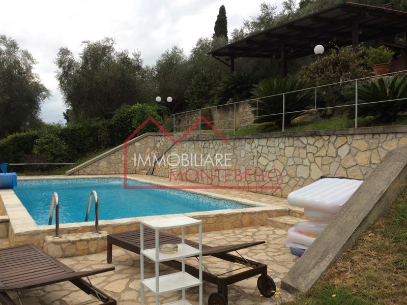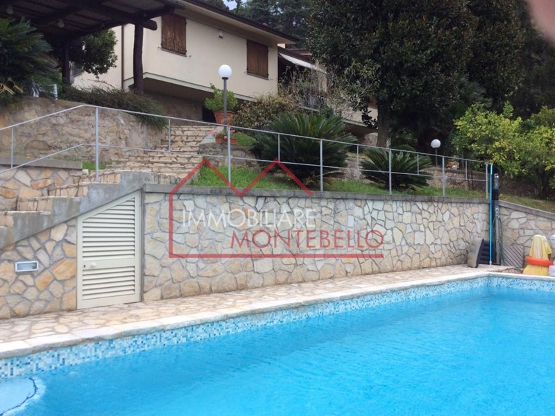 In vendita a Camaiore, zona Piano di Mommio, villa singola con piscina con bellissima vista mare e circondata da una terrazza giardino ben curata e ulivi.