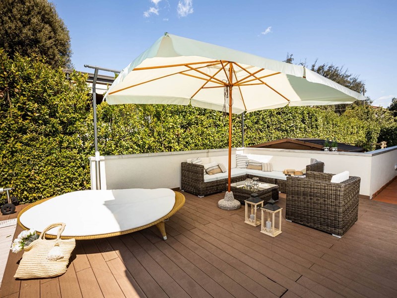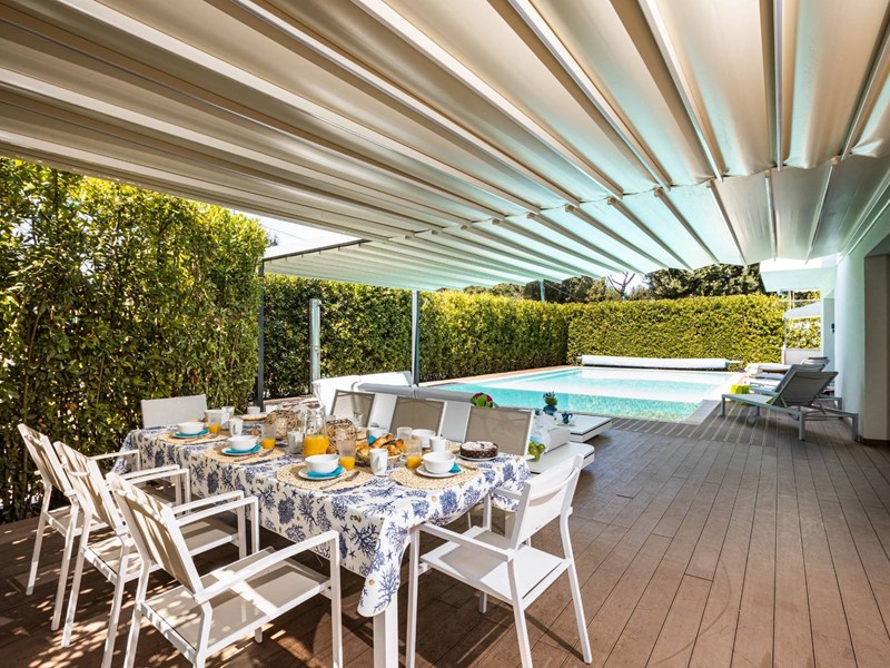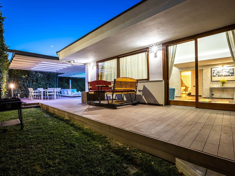 Il giardino della proprietà, interamente recintato, si sviluppa su quattro lati ed è totalmente pianeggiante e piantumato in parte a prato allinglese ed in parte pavimentato con doghe in resina. Al suo interno è ospitata la piscina e le adiacenti zone dedicate al living e al pranzo, il tutto ombreggiato da una copertura ad estensione automatica. Lintero perimetro del giardino è delimitato da unalta siepe dalloro a garanzia della vostra privacy.