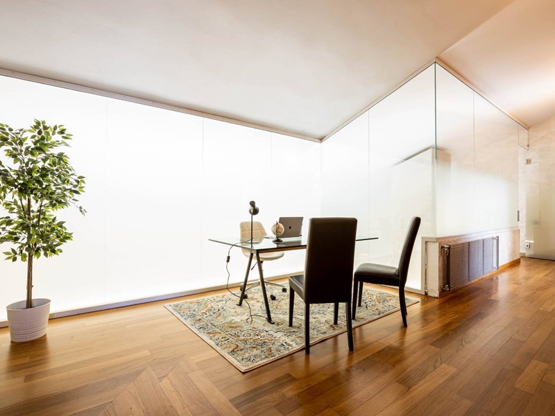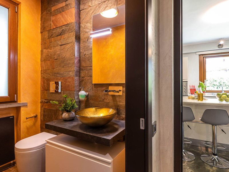 Al piano terra si trova un ampio open space, caratterizzato da ampie vetrate apribili, che ospita la zona living con angolo tv e comunicante con la luminosa cucina, la sala da pranzo, un bagno con doccia idromassaggio e un bagno di servizio, oltre alla zona lavanderia.
