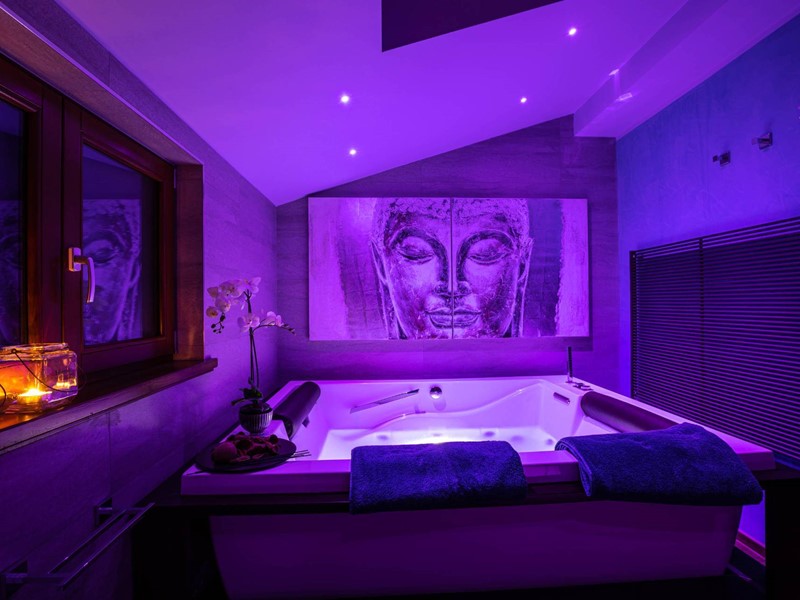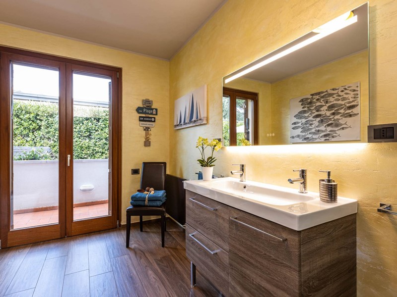 Dal piano terra, scendendo una rampa di scale, si raggiunge la sala giochi che ospita: un biliardo, un tavolo per il gioco delle carte, un videogioco da bar, un attrezzo Technogym per lo spinning e una smart-tv con divano. Sempre a questo piano con accesso dalla sala giochi o dallesterno si trova una suite con letto matrimoniale divisibile con bagno e zona cromoterapia con doccia.