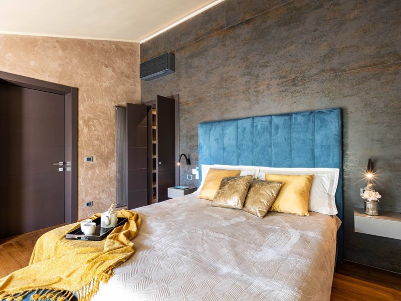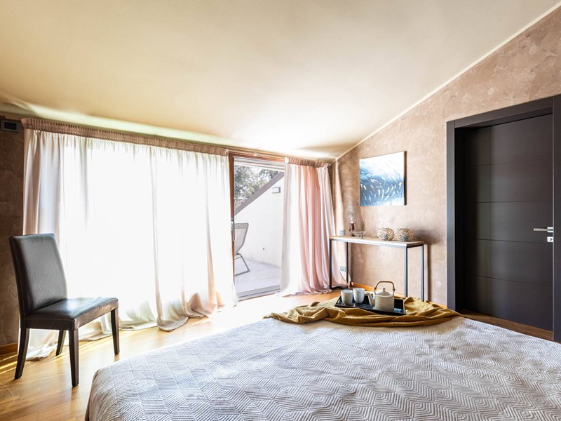 Salendo le scale si raggiunge la zona notte composta da una matrimoniale con letto king size, una matrimoniale, una doppia con letti unibili e un bagno con doccia e vasca idromassaggio.