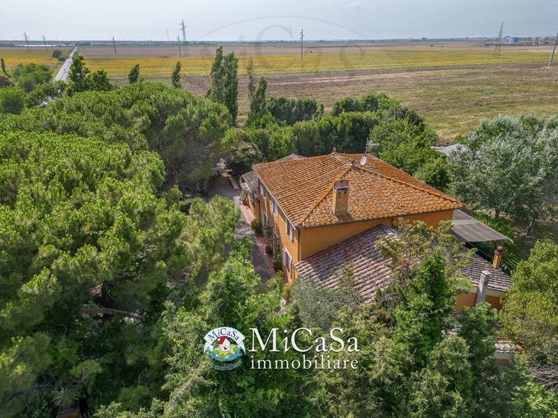 In campagna, in contesto verde e riservato, a 15minuti dalla città e da tutti i principali servizi, bellissima villa singola composta internamente al piano terra da ampio ingresso affacciato sul salone di 100mq diviso in tre ambienti comunicanti incorniciati dai grandi archi rivestiti in legno dipinto, grande cucina di 45mq in stile rustico con ampia stanza adiacente ad uso dispensa, sala pranzo con stupendo camino perfettamente funzionante e due studi utili anche come camere di 25mq ciascuno, di cui uno con bagno privato e accesso diretto al giardino sul retro. Salendo al piano superiore troviamo il grazioso bagno soppalcato, quattro stupende camere matrimoniali di 25mq e il bagno padronale con vasca e doppio lavandino.