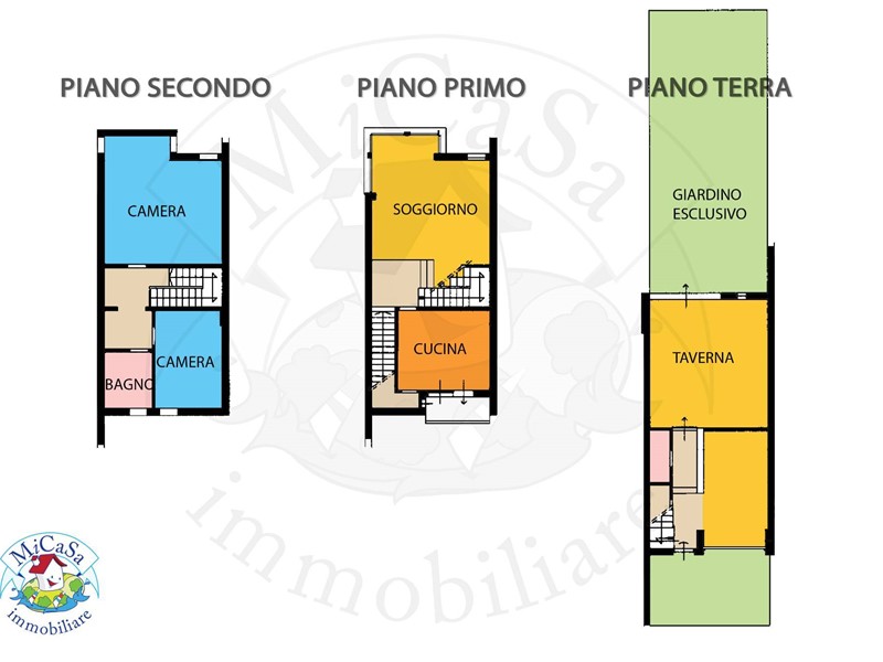 Composto al piano primo da ampio e luminoso soggiorno, cucina abitabile, ripostiglio, balcone: al piano superiore da camera matrimoniale la cui dimensione di 22 mq e le numerose finestre di cui è dotata consentono di ricavare una ampia zona armadi oppure uno studio o bagno in camera, bagno con finestra, cameretta. Al piano terra ampia taverna avente affaccio direttamente nel giardino esclusivo e bagno.