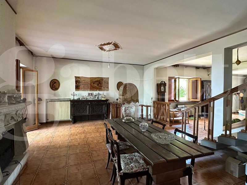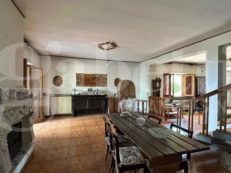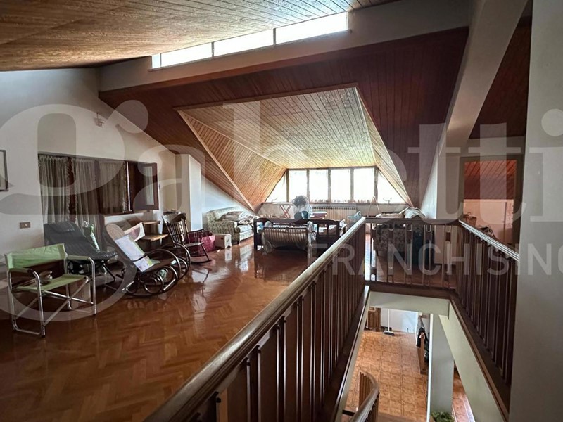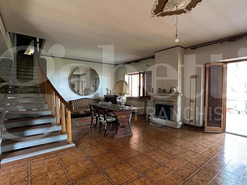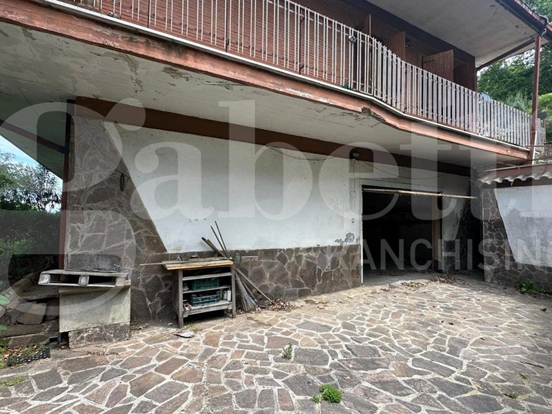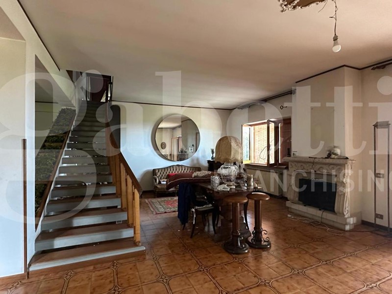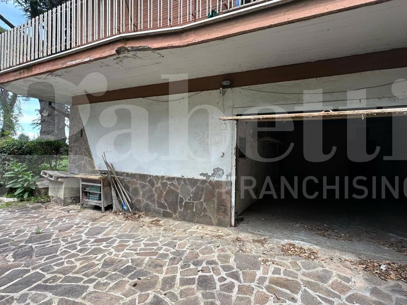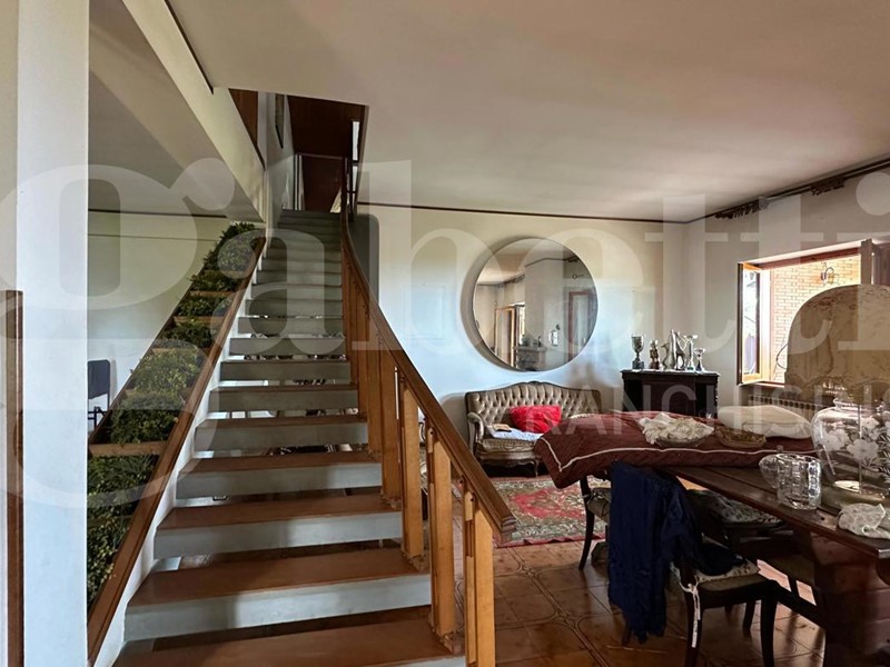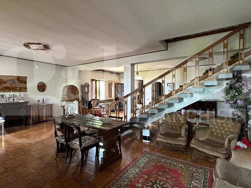 Internamente da ristrutturare, la casa si sviluppa su due livelli ed è composta da salone doppio, cucina abitabile, cinque camere da letto, due bagni e due ampi terrazzi perimetrali con una vista panoramica. Completa la proprietà un box auto e un giardino di 3000 mq.