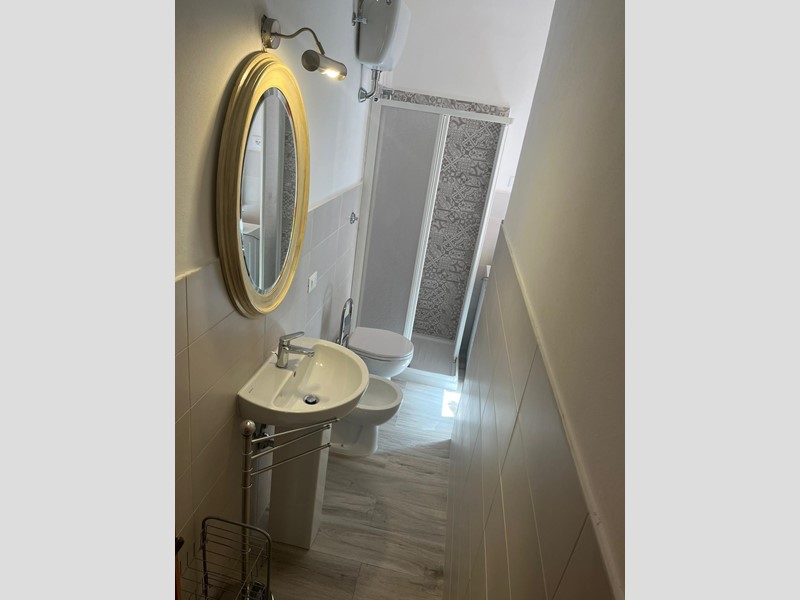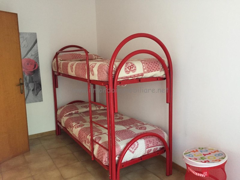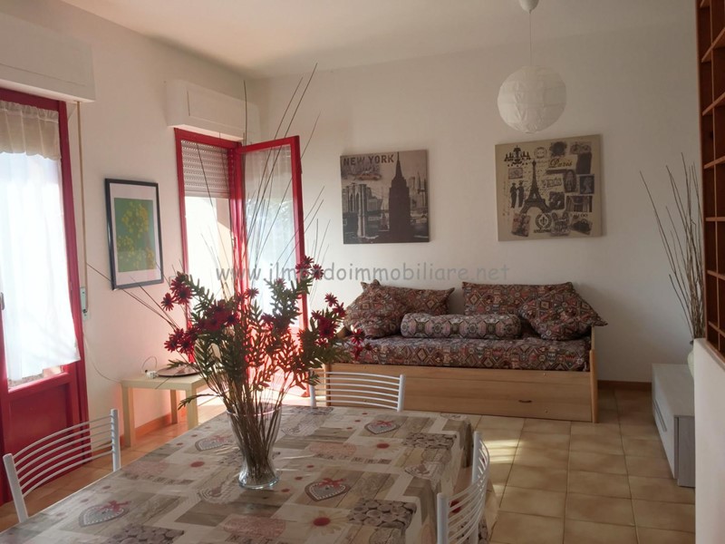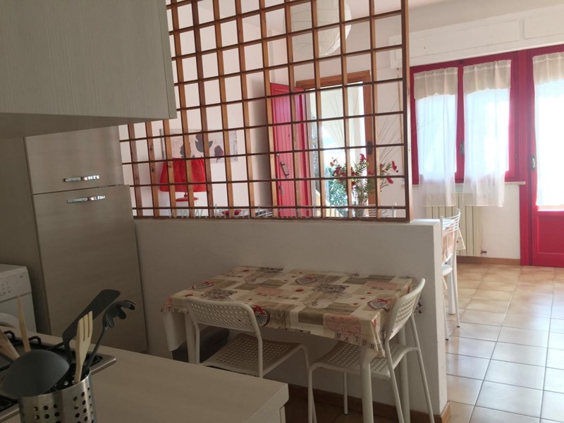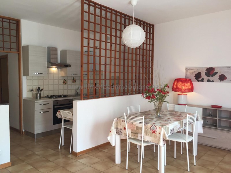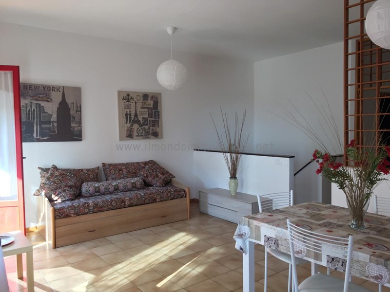Appartamento al piano rialzato composto da: gtìrande zona giorno con angolo cottura a vista, balcone con doppio accesso dalla zona giorno, tavolo da pranzo in soggiorno con divano letto, tavolo colazione nell'angolo cottura, camera matrimoniale, camera con letto a castello, bagno con vasca e finestra; collegamento interno con taverna finestrata