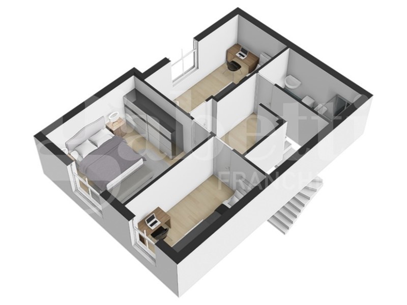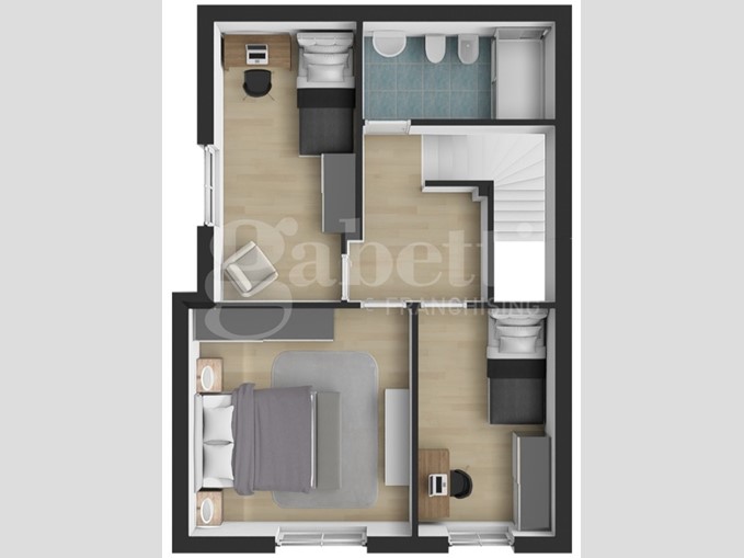 Al piano primo troviamo una camera matrimoniale da 15mq, disimpegno, due camere singole e bagno.