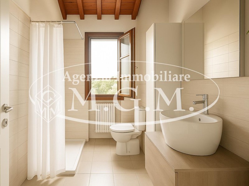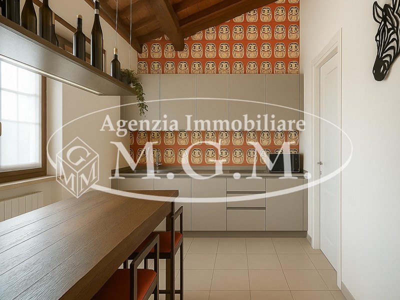 Le finiture interne sono di pregio, con soffitti a capanna in legno con travi e mezzane a vista, che donano calore e personalità all’ambiente.