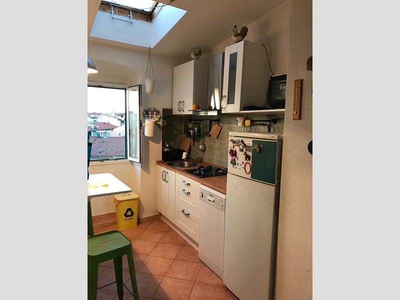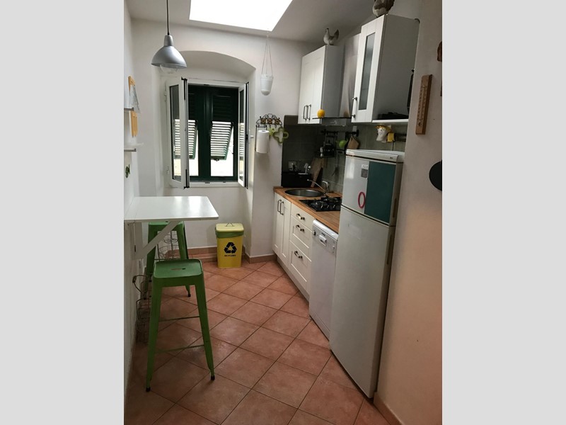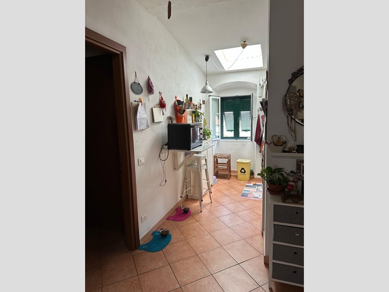 Soggiorno con doppio affaccio, cucinotto , disimpegno bagno con doccia e lucernario. Ripostiglio.