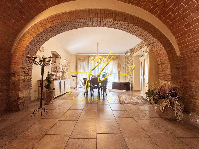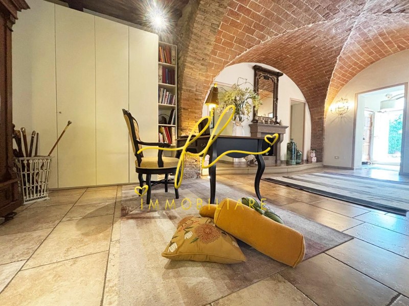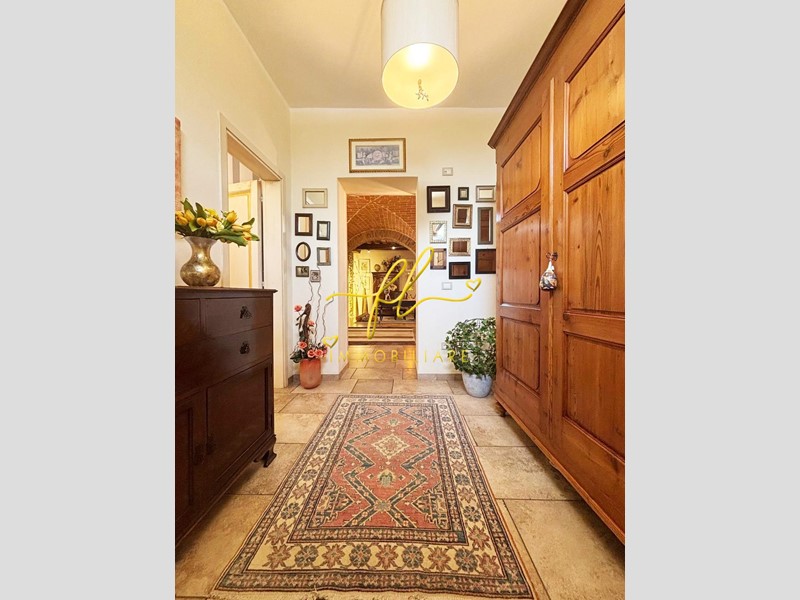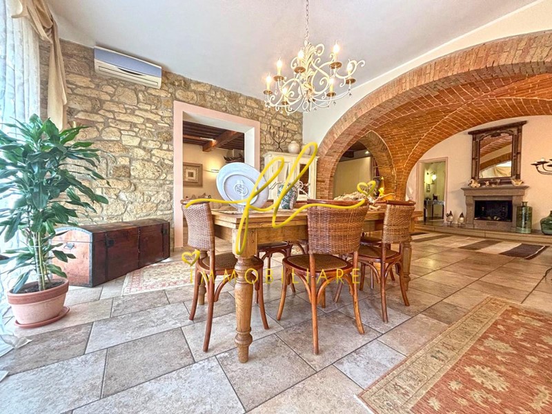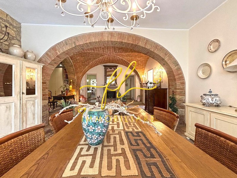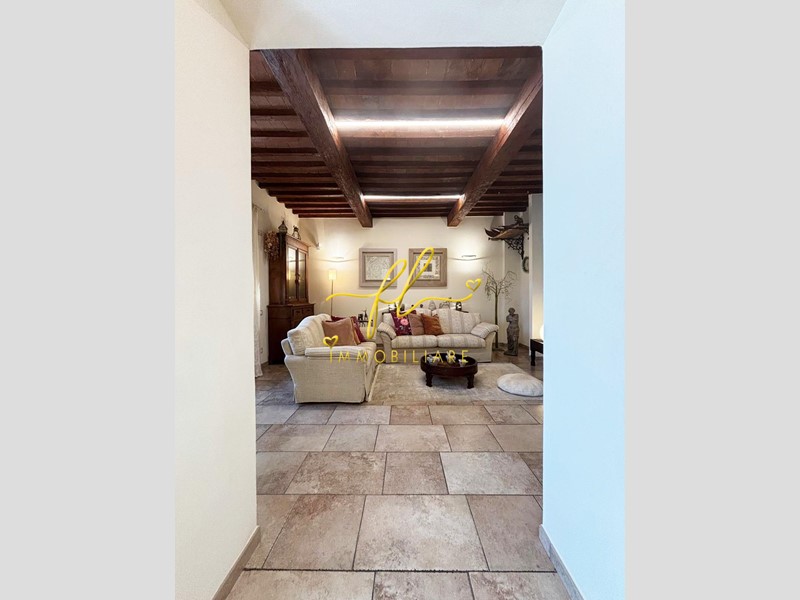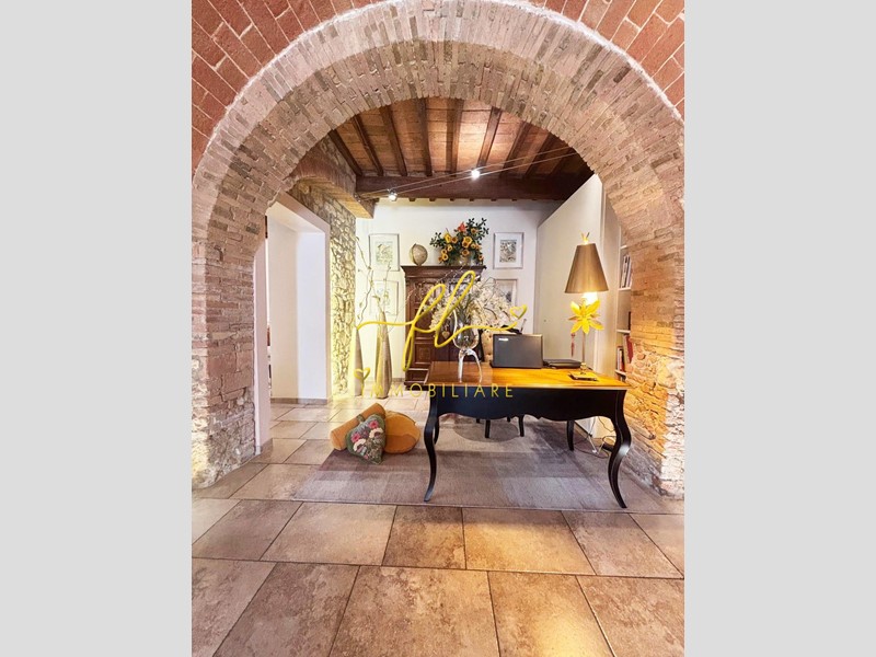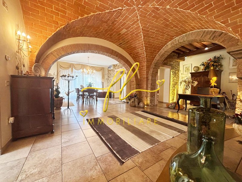 L’ingresso principale conduce a un’ampia zona giorno con uno splendido camino, caratterizzata da un salone triplo con archi a crociera e travi a vista in perfetto stile toscano.
