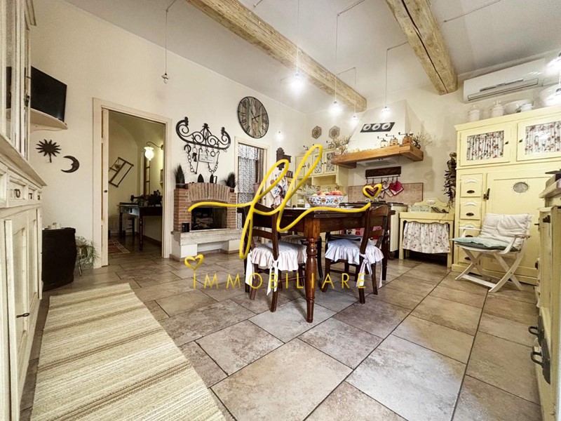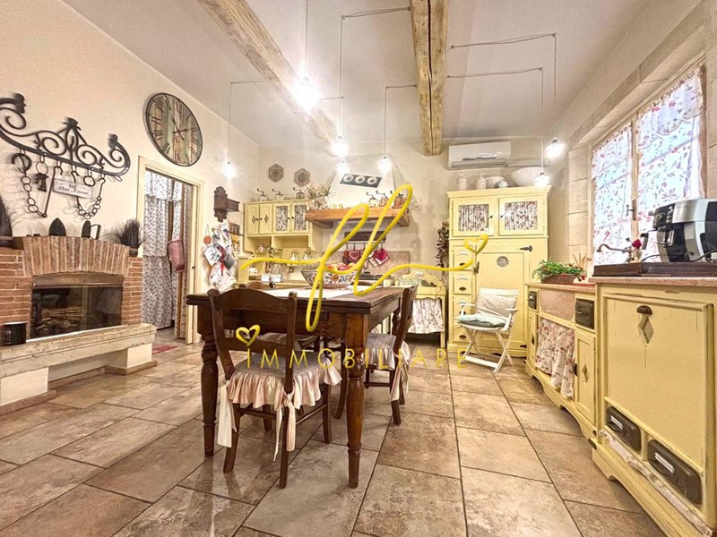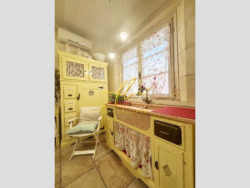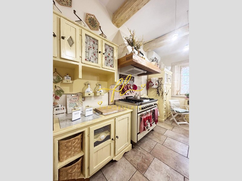 La cucina abitabile, separata e luminosa anch’essa con un bellissimo camino ed accesso ad un altro vano adibito a lavanderia.